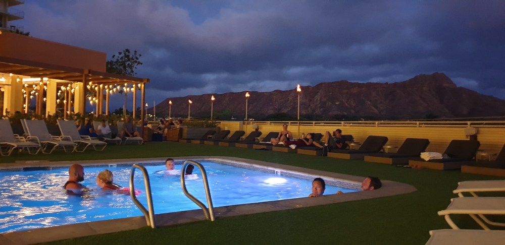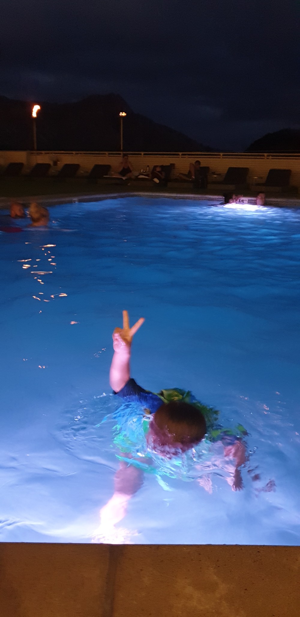 Da Julian noch nicht genug Wasser hatte für heute, sind wir nach dem Sonnenuntergang nochmal in den Hotelpool gehüpft und das ist ein tolles Fleckchen… nebenan direkt eine nette Bar mit einer kleinen Speisekarte, schöne Live Musik und ein gigantischer Ausblick