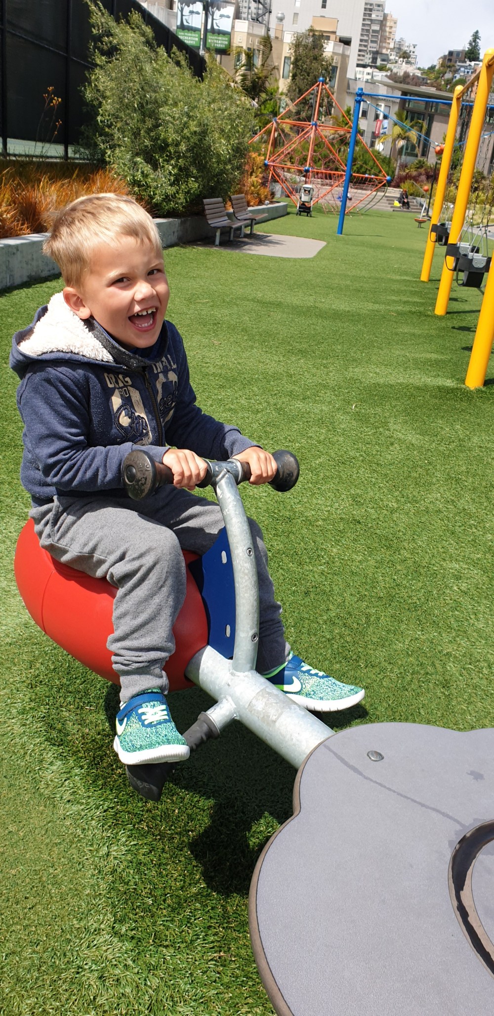 Nicht lange haben wir im Zimmer ausgeharrt, was aber auch daran lag, dass Julian die Hotelluft gar nicht bekam und er völlig am abdrehen war 🤪 Da war definitiv noch genug Energie vorhanden, also verkauften wir ihm den nächsten Spaziergang als reinen „Spielplatztestlauf“ – somit war das Genörgel auch etwas unterbunden 😉Auf dem Weg über den Jefferson Park, die Buchanan Mall, den Alamo Square, die Hayes Street bis zum Rathaus und wieder zum Hotel mussten wir feststellen dass es wirklich viele Spielplätze gibt – und ja, wir haben an jedem gehalten, aber nicht ohne auch ein paar Bilder von anderen Dingen gemacht zu haben – wie zum Beispiel den „Painted Ladies“ .