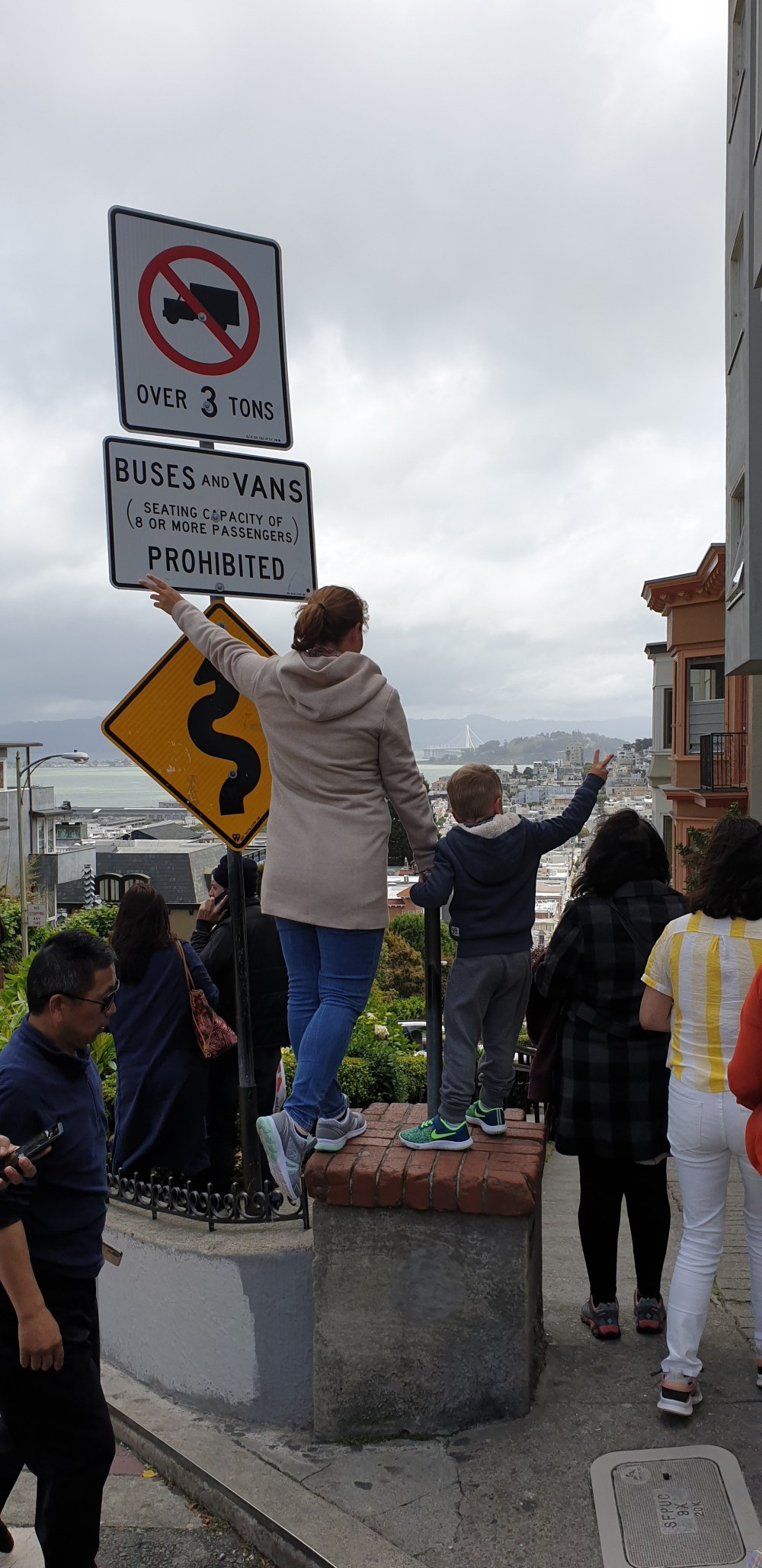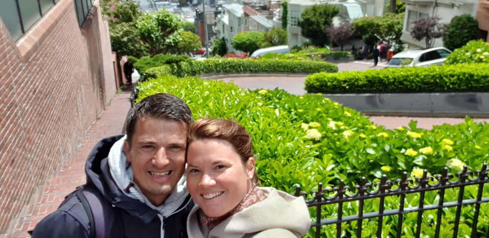 Das die Straßen in San Francisco tatsächlich bergauf und ab gehen haben wir während der Fahrt schon feststellen können.Was es aber bedeutet, diese zu begehen, durften wir kurz danach auch feststellen.Nachdem wir ein ganzes Stück vom Spielplatz, den wir eingeschoben haben, bis zur kurvigsten Straße der Stadt fast nur bergauf gelaufen sind… PUH – auf einmal kam s einem doch nicht mehr so kalt vor 😬